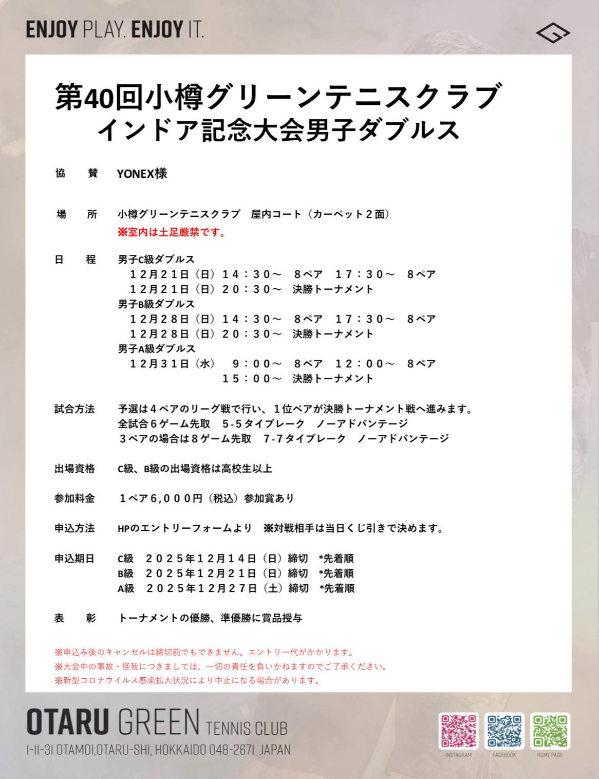 🎾第40回インドア記念大会男子ダブルスC級(12月21日17時30分〜)🎾