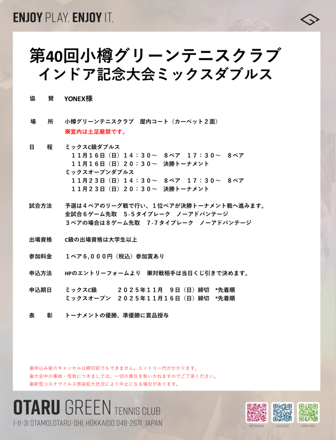 🎾第40回インドア記念大会ミックスダブルスオープン(11月23日17時30分〜)🎾